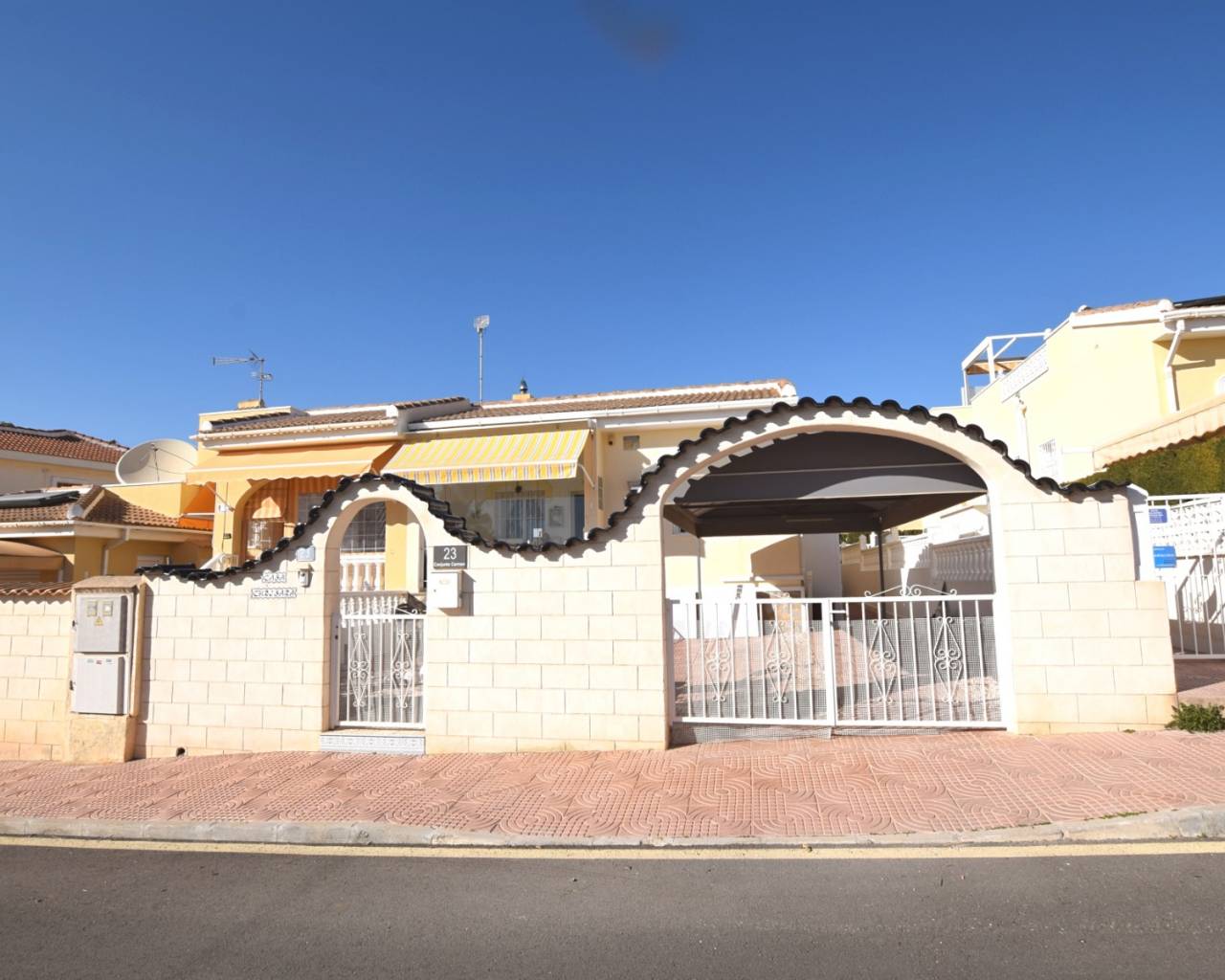 Access down the side of the property leads to a large patio terrace, once again totally refurbished complete with electric awnings and sides for total privacy and needed shade in the summer. There is also direct access to this rear patio from the kitchen. A staircase from this terrace leads up to a large rooftop terrace with superb views to the salt lakes.